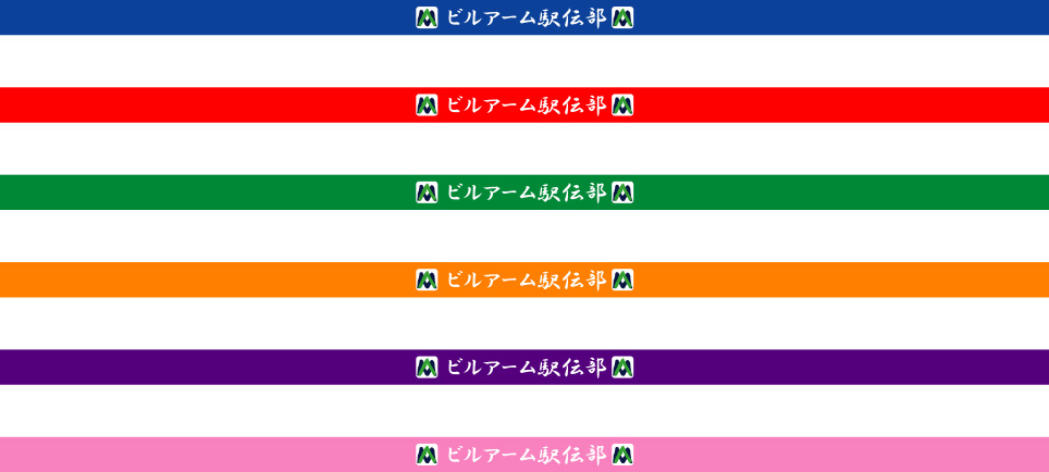 2011/11/1 ビルアーム駅伝6色はちまき 原稿案 更新日:2017年4月6日 公開日:2011年11月1日 オリジナル品の原稿デザイン はちまきの原稿案です。地の色はご要望がありました通り、6色色違いとなります。クリックすると画像が大きく表示されます。 タイトル:ビルアーム駅伝部はちまき 種類:はちまき サイズ:4cm幅*長さ120cm 生地:ポリエステル 仕立て:1本仕立て 加工:青赤緑橙紫桃地に白文字、マーク 原稿イメージは当社ホームページ上に保存しております。削除をご希望の場合にはご連絡くださいますようお願いいたします。 投稿ナビゲーション 2011/11/1 ビルアーム駅伝たすき 原稿案