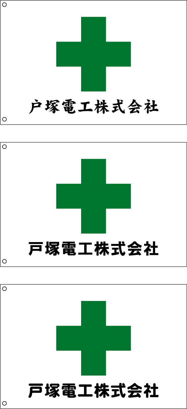 2011/11/9 戸塚電工株式会社 社名入り安全旗 原稿案 更新日:2017年4月6日 公開日:2011年11月9日 オリジナル品の原稿デザイン 安全旗の原稿案です。緑十字の下に黒文字で社名を名入れします。書体は上から、楷書、角ゴシック、丸ゴシックの3種類のイメージを作成いたしました。画像をクリックすると拡大表示されます。 タイトル:戸塚電工株式会社 安全旗 種類:旗 サイズ:W105cm*高さ70cm 生地:天竺木綿生地 仕立て:ハトメ左側2ヵ所 加工:黒文字で社名を名入れ 原稿イメージは当社ホームページ上に保存しております。削除をご希望の場合にはご連絡くださいますようお願いいたします。 投稿ナビゲーション 2011/11/9 日本橋二丁目通町会商店会バナー 修正原稿2011/11/10 JAPAZ 日除け幕 修正原稿