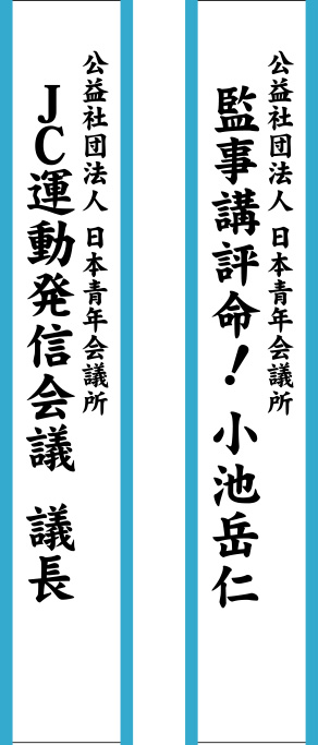 たすきの原稿案をお送りいたします。『公益社団法人日本青年会議所 JC運動発信会議 議長』と『公益社団法人日本青年会議所 監事講評命! 小池岳仁』の2種類の原稿内容になっております。先日お送りいただいたFAXを参考にしてレイアウトしております。文字はご希望いただいたように太めの楷書体でデザインしております。修正点、変更点などございましたらご連絡ください。また、画像をクリックすると拡大表示されます。