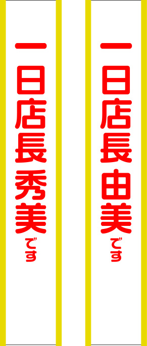 お送りいただいた文字データを元にたすきの原稿レイアウトを作成しましたので、ご覧ください。『一日店長 秀美です』と『一日店長 由美です』の2種類の原稿内容になっております。白地に前後に赤文字をプリントします。左右には金色のラインを縫い付けるような加工となっております。画像は半分折りにした状態のイメージですので、背中側にも同じように文字が入ります。修正点、変更点などございましたらご連絡ください。画像をクリックすると拡大表示されます。