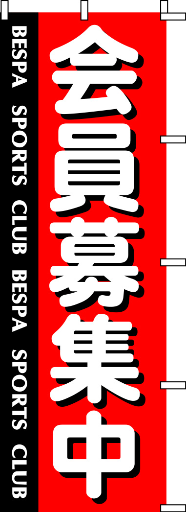 赤と黒の2色刷りのデザインです。「BESPA SPORTS CLUB」の部分は入会金無料と同じ書体になっています。会員募集中は丸ゴシックでレイアウトしております。のぼりのサイズは60cm弱、高さ180cmになります。左辺と裾の部分は補強のため折り返し縫いするようになります。画像をクリックすると拡大表示されます。