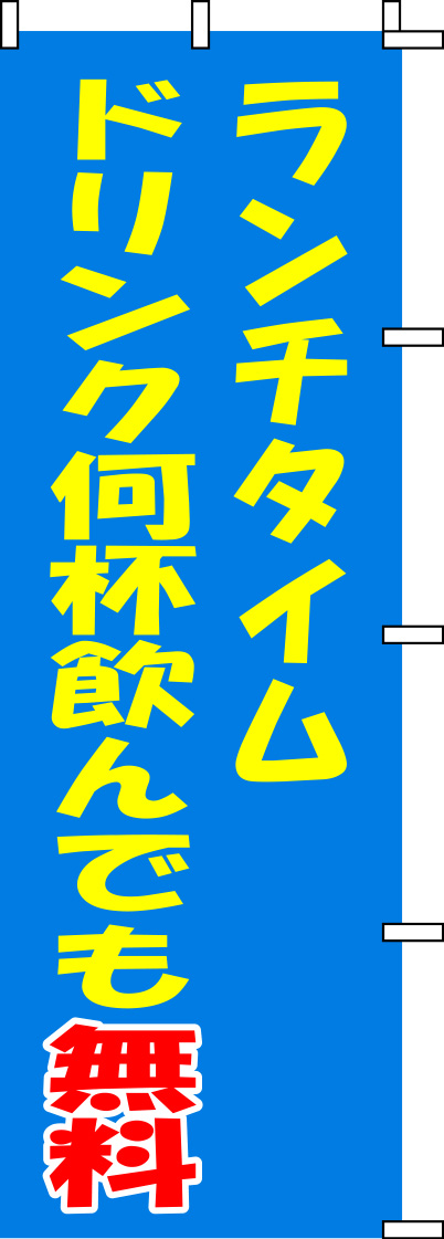 青地をベースに「ランチタイム ドリンク何杯飲んでも無料」の文字を創英角ポップ体でレイアウトしております。無料の文字は赤、それ以外の文字は黄色ですので、下地の青色に映えてよく目立つデザインです。のぼりのサイズは60cm、高さ180cmになります。ポール通しは右側で原稿を作成しておりますが、左側にすることもできますので、変更される場合にはご連絡くださいますようお願いいたします。画像をクリックすると拡大表示されます。