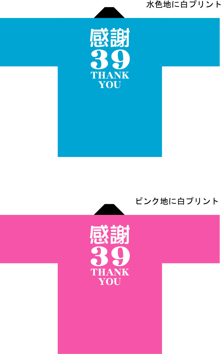 既製品のカラーハッピの背中部分に文字をプリントします。はっぴの色は水色地とピンク地の2種類になります。名入れ文字は「感謝 39 THANK YOU」の文字になります。水色、ピンクともに白文字でプリントする加工となります。文字は横25cm程度の範囲になりますので、着用すると背中いっぱいに文字が入るレイアウトになっています。修正点、変更点がありましたらご連絡くださいますようお願いいたします。画像をクリックすると拡大表示されます。