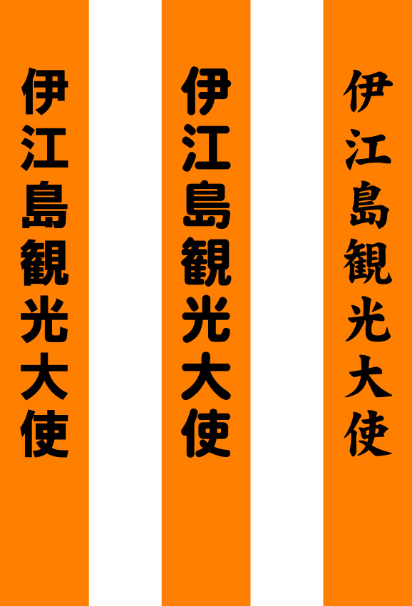 たすきの修正原稿をお送りいたします。村の文字を島に変更しております。幅11cm*1周150cmのたすきを半分折りに状態のイメージになります。胸側と背中側に「伊江島観光大使」と黒文字で入ります。文字の書体は「角ゴシック体」「丸ゴシック体」「楷書体」の3種類で作成しておりますのでご検討くださいますようお願いいたします。修正点、変更点などがありましたらご連絡ください。画像をクリックすると拡大表示されます。前回の原稿はこちらになります。