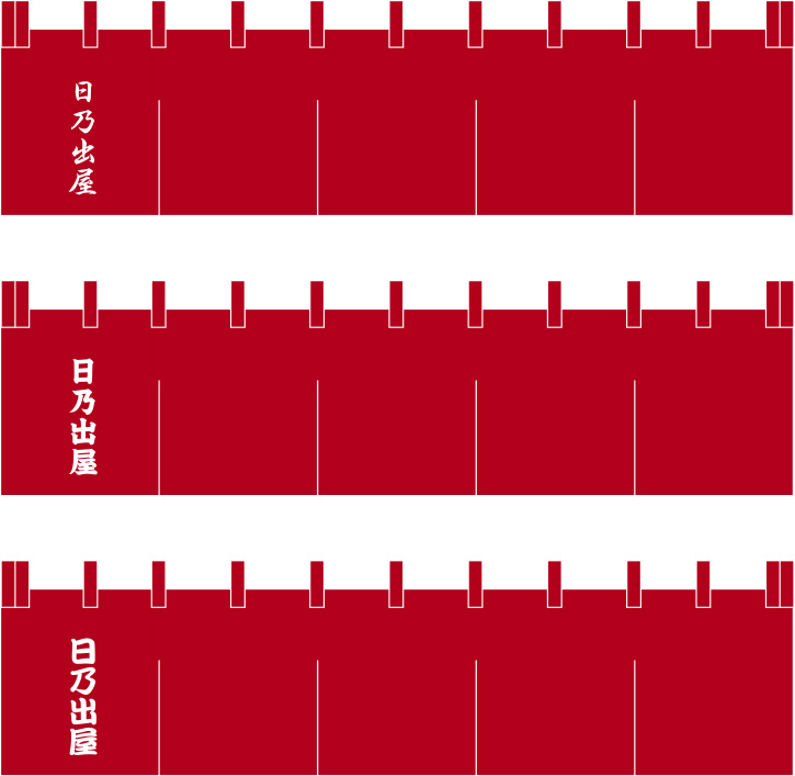 既製品のサイズぴったり暖簾Bタイプに名入れをしたイメージ原稿です。横170cm、高さ40cmの暖簾の左側にタテ組で「日乃出屋」と文字入れします。生地はエンジ色の木綿素材です。印刷は白文字を片面印刷する加工方法となります。文字の書体は一番上が「行書体」、中央が「楷書体」、下が「江戸文字」の3種類で原稿レイアウトを作成しております。修正点、変更点などありましたらご連絡ください。画像をクリックすると拡大表示されます。