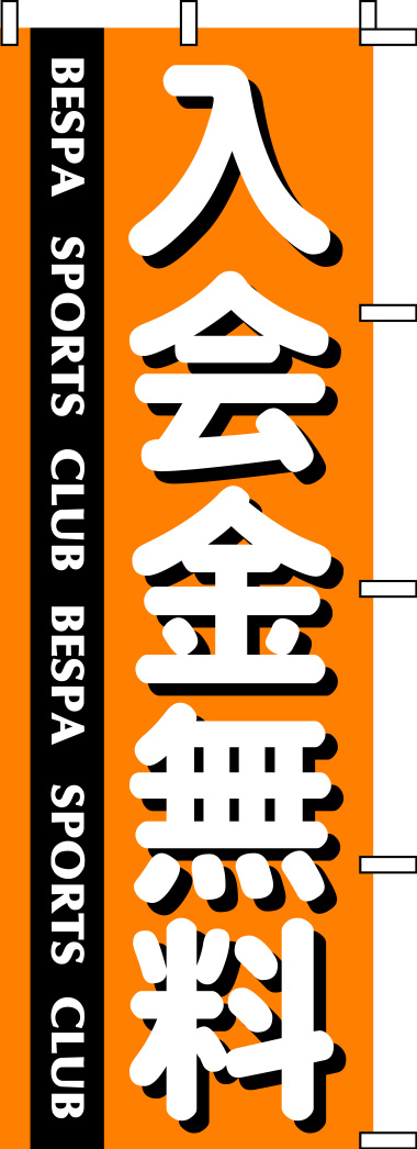 のぼり旗の原稿イメージを修正いたしました。左側の黒帯の「BESPA SPORTS CLUB」の部分を少し右に移動し、右側のオレンジベタに入っている「入会金無料」の文字も微調整いたしました。書体は前回と同じ、丸ゴシック体と使っています。のぼりのサイズは60cm弱、高さ180cmになります。左辺と裾の部分は補強のため折り返し縫いするようになります。画像をクリックすると拡大表示されます。
