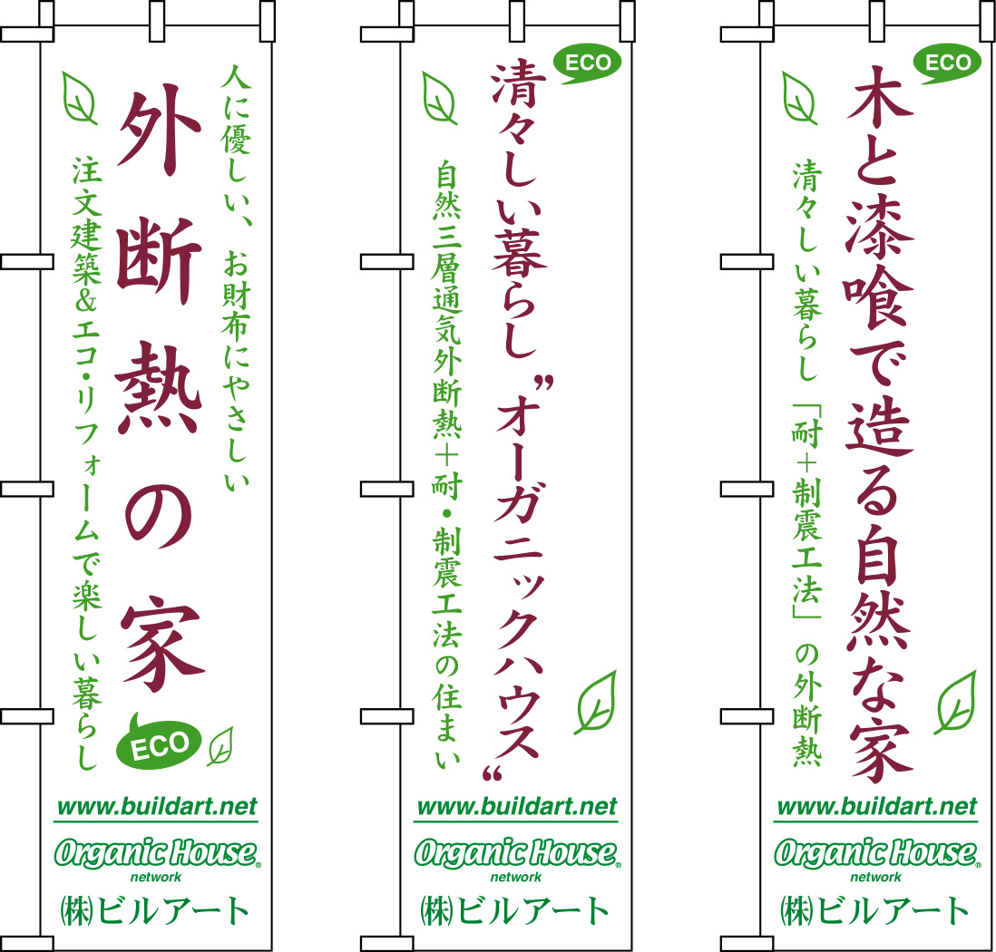 のぼりの原稿イメージを作成いたしました。サイズは前回同様、横45cm・高さ180cmの大きさになっております。白地に黄緑と緑、エンジ色の配色も前回通りです。「清々しい暮らし オーガニックハウス」と「木と漆喰で造る自然な家」の原稿は前回のままですので変更点はないです。いちばん左側の原稿は、前回の「良い家つくり隊」の部分を「外断熱の家」に差し替えてレイアウトしております。左右のサブタイトルなどの文字列はそのままになっております。修正点、変更点などありましたらご連絡ください。画像をクリックすると拡大表示されます。