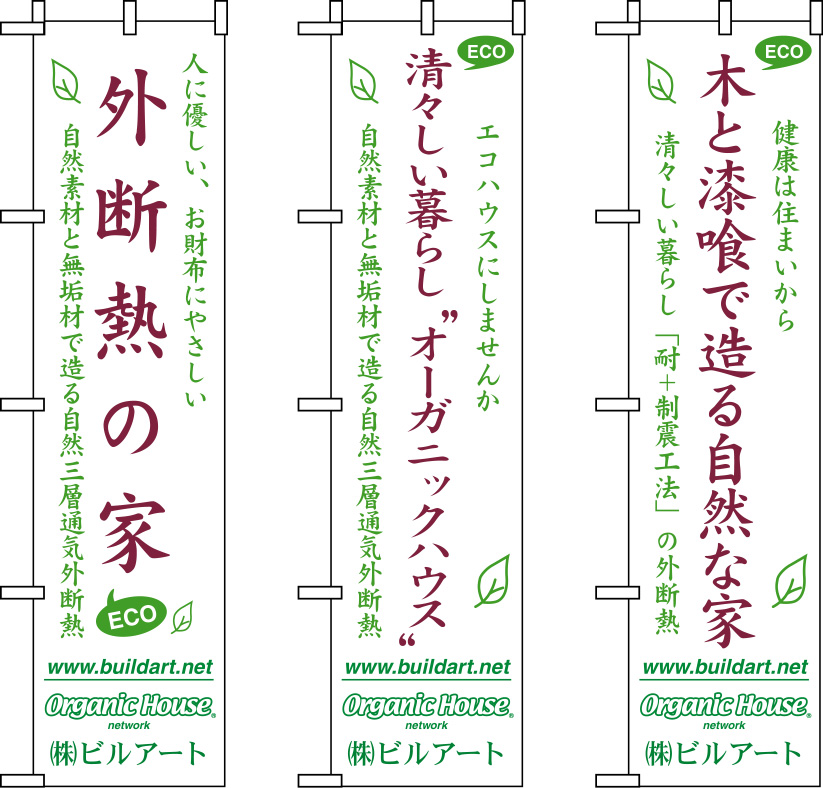 のぼりの原稿イメージを修正いたしました。右のデザインは「健康は住まいから」の文字を右側の余白部分に追加いたしました。中央のデザインはサブキャッチの部分を「エコハウスにしませんか」「自然素材と無垢材で造る自然三層通気外断熱」という文字に変更いたしました。左側のデザインは、中央と同じ「自然素材と無垢材で造る自然三層通気外断熱」の文字を入れるように変更しております。サイズは前回同様、横45cm・高さ180cmの大きさで変更がありません。白地に黄緑と緑、エンジ色の配色も前回通りです。修正点、変更点などありましたらご連絡ください。画像をクリックすると拡大表示されます。