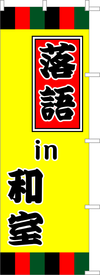 のぼり旗の仕上がりイメージをお送りいたします。黄色地をベースに上下に定式幕の黒・赤・柿茶の3色をあしらっています。メインの文字は「落語 in 和室」の文字です。和室の部分は枠取りをして目立つようにデザインしてあります。旗のサイズは横60cm・高さ180cm、生地はテトロンポンジというポリエステル生地になります。加工はインクジェットによるフルカラー印刷になります。修正点、変更点などありましたらご連絡ください。画像をクリックすると拡大表示されます。