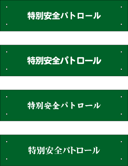 腕章の仕上がり原稿イメージをお送りいたします。既製品カラー腕章(WN-3001)に「特別安全パトロール」の文字をプリントします。腕章の色は緑、文字は白になります。文字の書体は上から「角ゴシック体」「丸ゴシック体」「楷書体」「明朝体」の4種類でレイアウトを作成しておりますので、ご検討くださいますようお願いいたします。画像をクリックすると拡大表示されます。修正点、変更点などありましたらご連絡くださいますようお願いいたします。