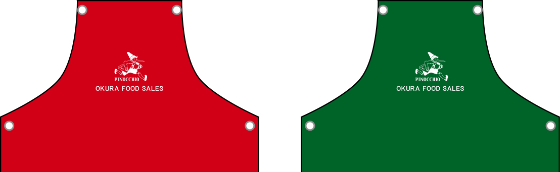 エプロン名入れの原稿を修正いたしました。既製品のカラーエプロン(ロープ型、EP-3001)に名入れ加工する文字を一部変更しております。前回は「OKURA FOOD SALES CO.,LTD. 」となっていた英文字部分を「OKURA FOOD SALES」に変更しております。横の長さ全体は同じですが、文字数が少なくなった分、1文字の大きさを大きくしております。上の部分にある「PINOCCHIO」のイラストなどは前回と同じ位置、同じ大きさになっております。原稿内容に修正点、変更点などありましたらご連絡ください。また画像をクリックすると拡大表示されます。