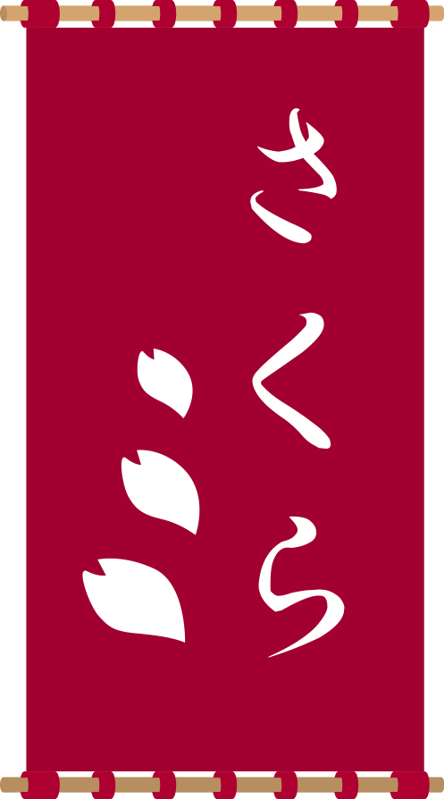 日除け幕に名入れした仕上がりイメージになります。既製品のエンジ色無地の日除け幕(NR-0004)に白で片面プリントする名入れ加工となります。幕の大きさは横は約105cm、高さは棒通し部分を含めて210cmです。生地は木綿100%素材です。名入れする内容は、全体の右側に「さくら」の3文字を行書体で大きめに配置し、左側には桜のはなびらをイメージしたイラストを3つ並べたレイアウト原稿になっております。花びらは上から下に徐々に大きくしてあります。