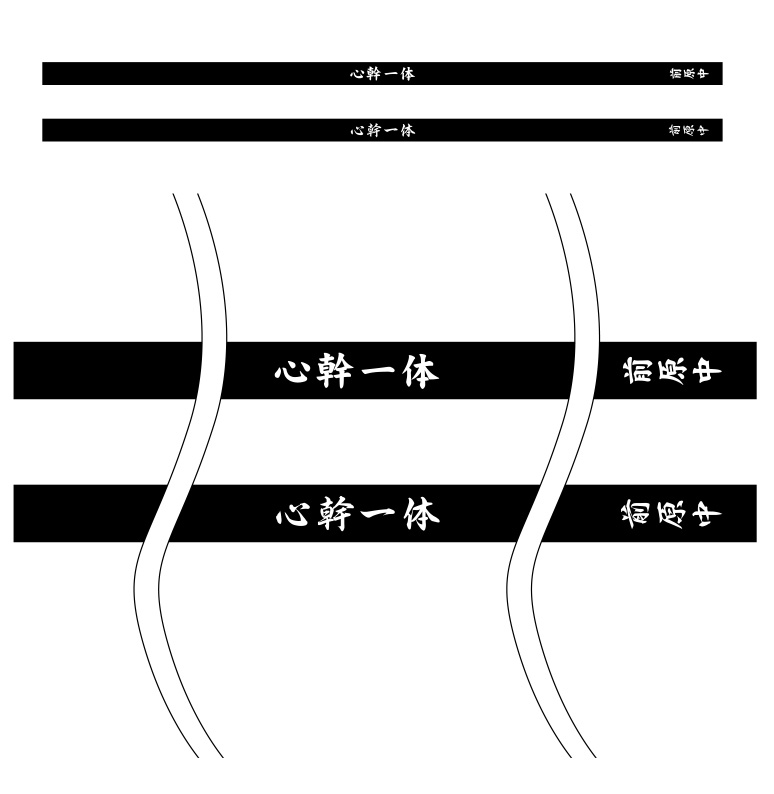 中央の額部分は「心幹一体」の4文字、右端には縦組みで「前原中」の3文字を刺繍します。文字の書体は上側が「楷書体」、下側が「行書体」でレイアウトを作成しております。文字や配置などに修正点、変更点などありましたらご連絡ください。画像をクリックすると拡大表示されます。
