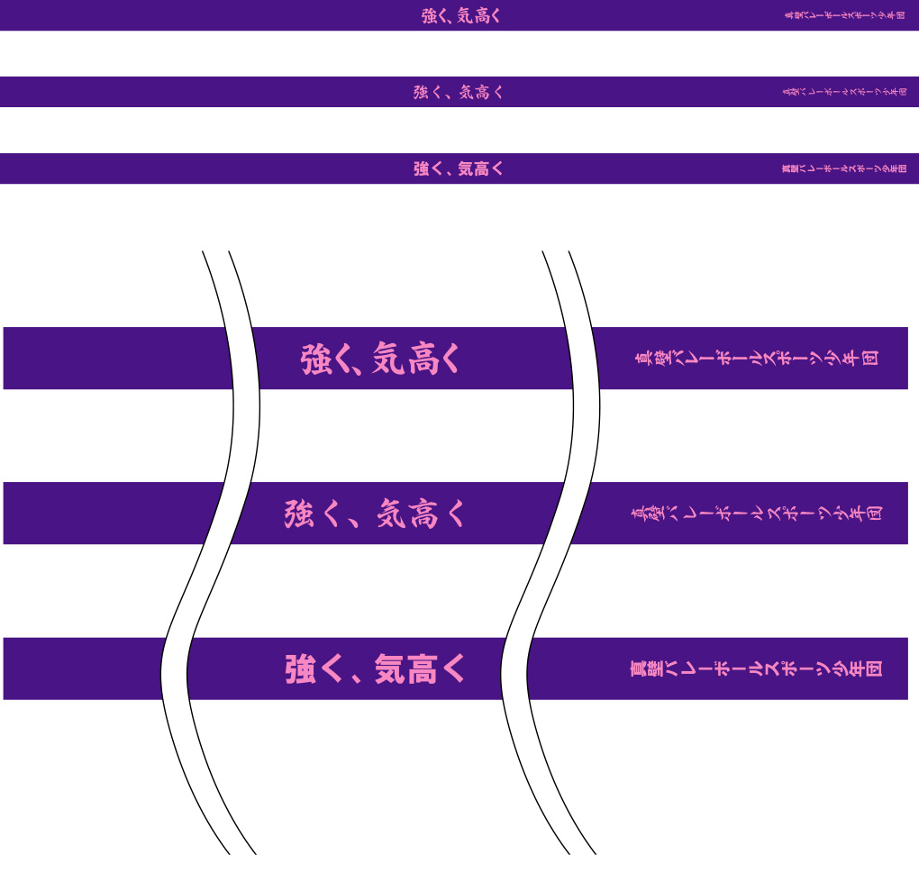中央の額部分に「強く、気高く」の6文字、右端には縦組みで「真壁バレーボールスポーツ少年団」の文字を入れます。原稿案の書体は上から「楷書体」「行書体」「角ゴシック体」の3通りでレイアウトを作成しておりますが、文字の大きさや位置・書体など、修正点、変更点などありましたらご連絡ください。画像をクリックすると拡大表示されます。
