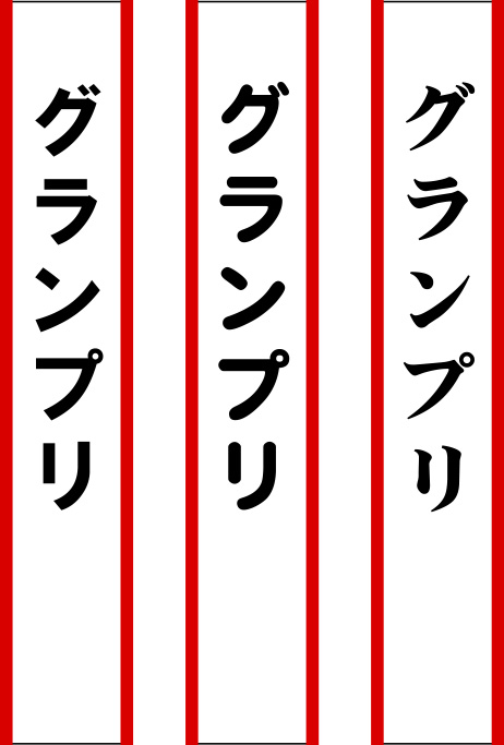 タスキの仕上がりイメージをお送りいたします。既製品の赤ライン付タスキ(TK-0002)に文字入れします。たすきの大きさは横幅14cm、長さ160cmになります。光沢のある芯入りポリエステル生地を使い、左右には赤いラインが縫い付けてあります。 名入れする内容は「グランプリ」の5文字です。着用した際に字が中央に見えるように、上下に少し余白を取ってレイアウトしております。下の画像は半分に折った状態ですので同じ内容の文字が背中側にも印刷されます。 文字の書体は左側から「角ゴシック体」「丸ゴシック体」「明朝体」の3通りで作成しております。原稿内容、書体などに、修正点・変更点などありましたらご連絡ください。また画像をクリックすると拡大表示されます。
