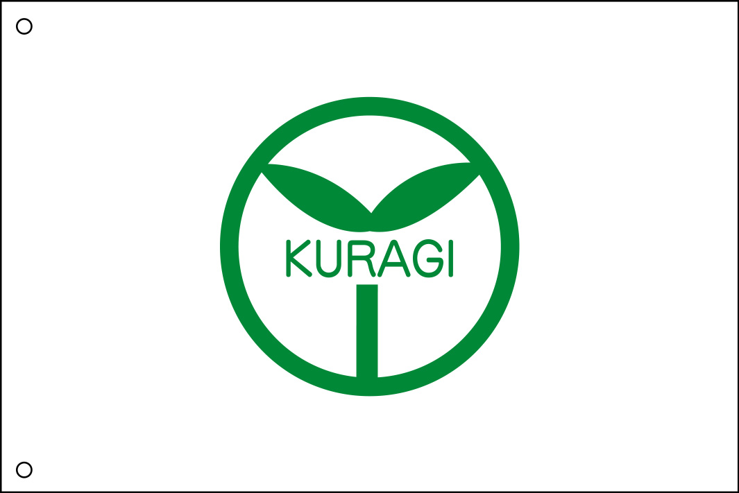 お送りいただいたロゴマークを白地の旗の中央部分にレイアウトしております。緑の丸に葉っぱのモチーフとKURAGIの英文字が入ったデザインになります。ロゴマークは縦のラインが垂直になるように調整しておりますのでご確認くださいますようお願いいたします。