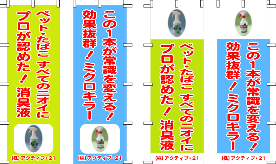 印刷内容は「ペット・たばこ すべてのニオイにプロが認めた!消臭液」の文字と「この1本が常識を変える!効果抜群!ミクロキラー」の2種類です。色は前回と同じ水色地と黄緑地で原稿を作成しております。また、写真の位置を上にしたレイアウトパターンも作成いたしましたのでご検討ください。