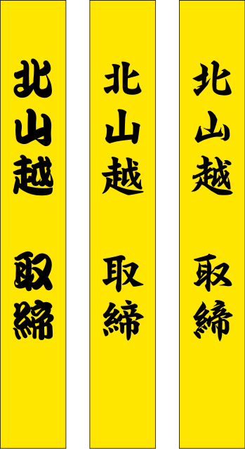 「北山越 取締」の文字間隔を広げて、越と取の文字の間を1文字分空けております。また書体は左側から「江戸文字」「楷書体」「行書体」の3通りでレイアウトを版下を作成しております。