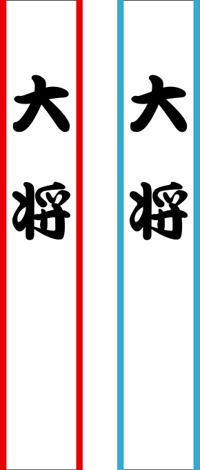 たすきの仕上がりイメージをお送りいたします。既製品の赤ライン付きタスキ(TK-0002)と青ライン付きタスキ(TK-0007)に名入れ加工をします。