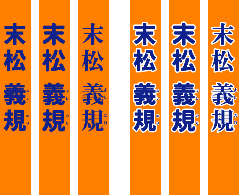 文字内容は、オレンジ地に青文字で「末松義規」4文字が入ります。名前の横には「よしのり」とふりがなを入れるようにいたします。