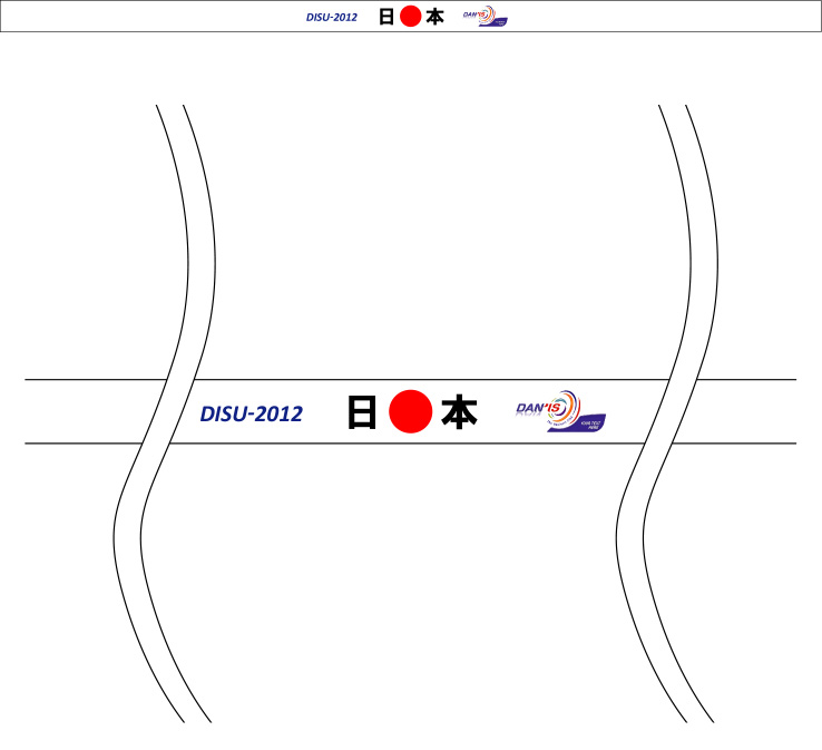 原稿の内容は、額部分中央に日の丸と「日本」の2文字、その右側にはお送りいただいたロゴマーク、左側には「DISU-2012」の文字をレイアウトしております。