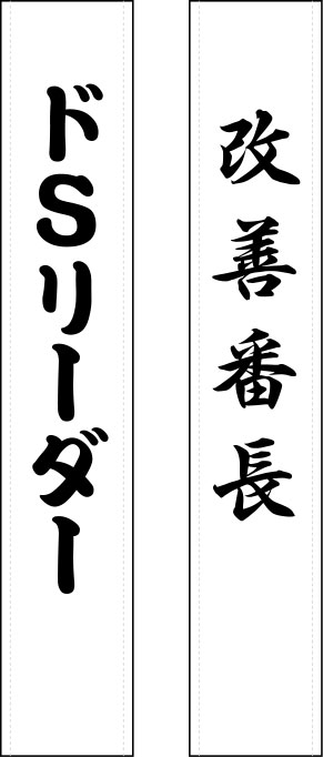 名入れの原稿内容は、「ドSリーダー」「改善番長」 の2種類です。「ドSリーダー」は江戸文字、「改善番長」は行書体でレイアウトを作成しております。下の原稿は160cmを半分に折ったイメージですので実際には背中側にも同じ文字を印刷するようにいたします。