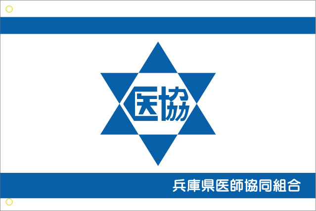 原稿内容は、旗の中央に「医協」のマーク、上下に青ラインのデザインです。下ラインの右下部分には「兵庫県医師協同組合」の文字が丸ゴシック体で入ります。マークの大きさやラインの太さなどは「兵庫県医療信用組合」様の旗と同じレイアウトになっております。
