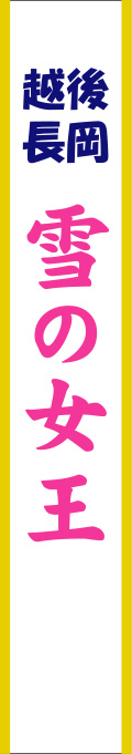 タスキの原稿イメージを修正いたしました。タスキ本体の仕様は前回と同じで、サイズは14cm幅×長さ160cm、左右に金ラインのついたタスキ(TK-0005)になります。変更内容は、「雪の女王」のピンク文字を角ゴシック体から楷書体へ変更しております。「越後長岡」の4文字は前回と同じポップ書体となっております。文字や大きさや位置など修正点・変更点などありましたらご連絡ください。また画像をクリックすると拡大表示されます。