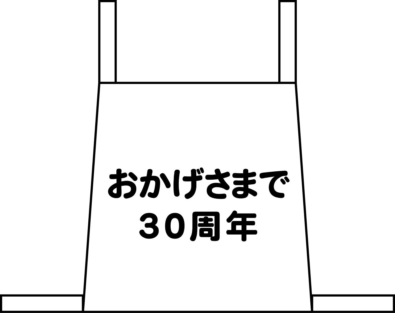 ゼッケンの原稿イメージを作成いたしました。既製品のカラー無地ゼッケン(ZK-3001)に名入れ加工をします。ゼッケン本体の大きさは高さ28cm、横28cmです。原稿の内容は、「おかげさまで30周年」の文字を胸側のみにプリントします。下地の色は白・文字の色は黒で原稿を作成しております。文字の書体や大きさ、位置などに修正点・変更点などがありましたらご連絡ください。また画像をクリックすると拡大表示されます。