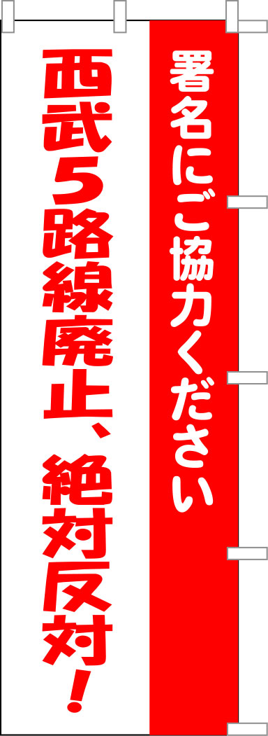 のぼりの原稿を作成いたしました。サイズは横60cm×高さ180cm、生地はテトロンポンジを使用した一般的なタイプののぼり旗になります。。原稿の内容は、右側に「署名にご協力ください」の文字を赤地に白文字、左側には少し大きめに「西武5路線廃止、絶対反対!」と入るデザインになっております。右側の文字は丸ゴシック体、左側の文字はPOP書体で原稿を作成しております。ポール通しは右側に来るようにレイアウトしておりますが、反対の左側にすることも可能ですので、変更がある場合にはご連絡ください。文字の大きさや位置、フォントなどに修正点・変更点などがありましたらご連絡ください。また画像をクリックすると拡大表示されます。