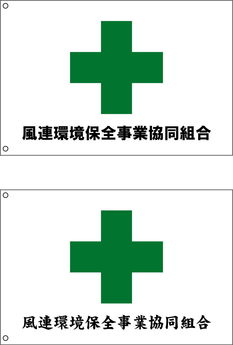 名入り安全旗の原稿を作成いたしました。緑十字の下に黒で団体名を印刷します。旗本体のサイズは横135cm×高さ90cm、生地は天竺木綿を使用しております。原稿内容は、緑十字の下部分に「風連環境保全事業協同組合」の文字を黒で印刷します。文字の書体は角ゴシック体と楷書体の2通りで版下を作成しておりますのでご検討ください。文字の書体や大きさなど、原稿内容に修正点・変更点などがありましたらご連絡ください。また画像をクリックすると拡大表示されます。