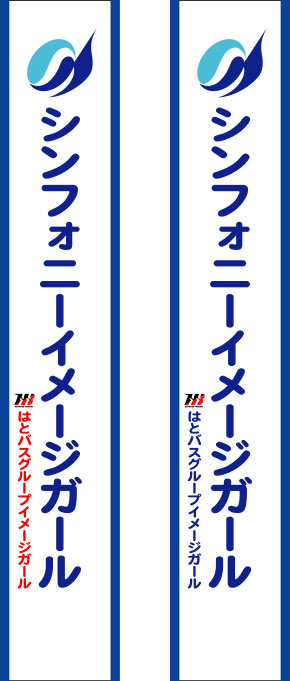タスキの原稿イメージを修正いたしました。本体の仕様は前回と同じで、横14cm×長さ160cm、芯入りのポリエステル生地にフルカラー印刷をします。左右には青いラインを縫い付けます。修正の内容は、左下の「はとバスイメージガール」の文字を「はとバスグループイメージガール」に変更しております。メイン文字の「シンフォニーイメージガール」の文字列と下揃えにしておりますので、文字数が増えた分、少し上に位置を調整しております。文字の色は赤と青の2種類の原稿を作成しておりますのでご検討ください。文字・ロゴマークの大きさや位置などに、修正点・変更点などがありましたらご連絡ください。また画像をクリックすると拡大表示されます。