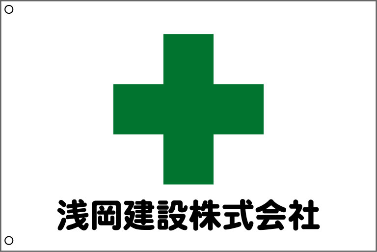 安全旗名入れの原稿イメージをお送りいたします。旗の大きさは横135cm×高さ90cm、オーソドックスな天竺木綿を使った安全旗になります。名入れする文字は、緑十字の下部分に「浅岡建設株式会社」の文字を黒で印刷します。文字の書体は丸ゴシック体でレイアウトを作成しております。文字の書体や大きさ・位置などに、修正点・変更点などがありましたらご連絡ください。また画像をクリックすると拡大表示されます。