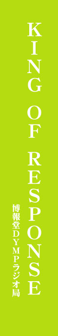 タスキの原稿イメージを作成いたしました。本体のサイズは14cm幅×1周160cm、木綿生地を使ったタスキになります。原稿の内容は、「KING OF RESPONSE」の文字を大きく入れ、左下に少し小さ目で「博報堂DYMPラジオ局」の文字を入れたデザインになります。下地の色は黄緑、文字の色は白になります。