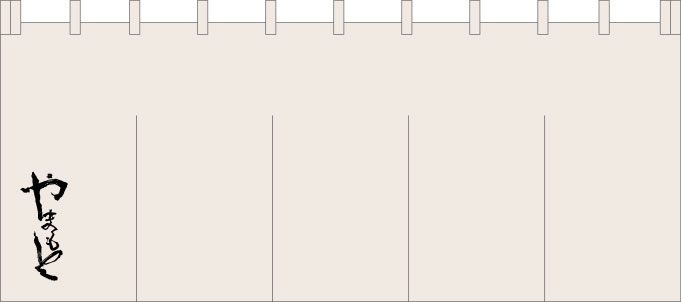 のれん名入れの仕上がりイメージをお送りします。本体の大きさは横200cm×高さ82cm、麻生地を使った暖簾です。仕立ては5枚割れで、上部に棒通しのチギレを縫い付けます。名入れの内容は、一番左側の部分に「やまもと」の4文字をワンポイントで名入れします。黒文字を片面プリントする加工内容となります。文字の書体はお送りいただいたFAXをもとにレイアウトしております。文字の大きさや位置などに修正点・変更点などがありましたらご連絡ください。また画像をクリックすると拡大表示されます。