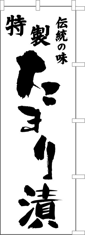 のぼりの原稿イメージをお送りいたします。旗本体の大きさは横60cm弱×高さ180cm、トロピカル生地を使ったのぼり旗です。文字の内容は、以前の紫地の原稿をベースにして、白地に黒文字で版下を作成しております。右上に「伝統の味」、中央に「特製 たまり漬け」の文字を配置したレイアウトとなります。文字の大きさや位置など、原稿内容に修正点・変更点などがありましたらご連絡ください。また画像をクリックすると拡大表示されます。