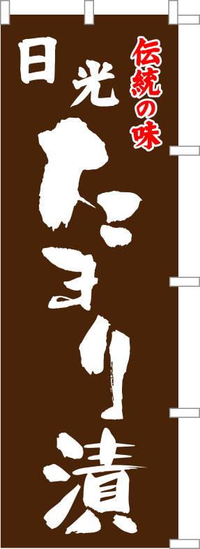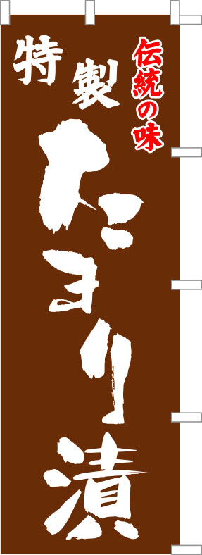 のぼりの原稿イメージを修正いたしました。下地の色を茶色、「特製 たまり漬け」の文字を白に変更しております。また、右上の「伝統の味」の4文字は赤文字に白フチをつけた原稿となっております。文字の大きさや位置など、原稿内容に修正点・変更点などがありましたらご連絡ください。また画像をクリックすると拡大表示されます。