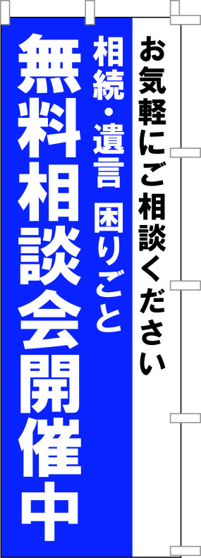 のぼりの仕上がりイメージをお送りいたします。オーソドックスな60cm×180cmのサイズでテトロンポンジという名称のポリエステル素材の生地を使います。原稿の内容は、既製品のNB-0045「ひざの痛み」をベースに、「相続・遺言 困りごと」「無料相談会開催中」の文字を入れた原稿になります。文字の書体は角ゴシック体でレイアウトを作成しております。文字の位置やサイズなど、原稿内容に修正点・変更点などがありましたらご連絡ください。また画像をクリックすると拡大表示されます。