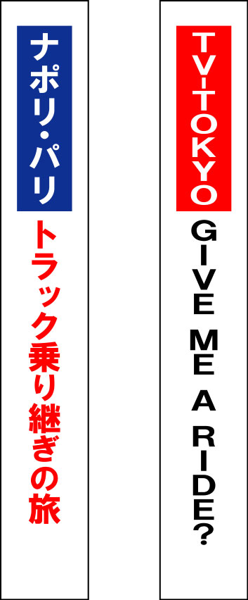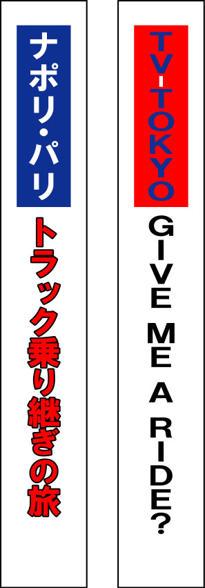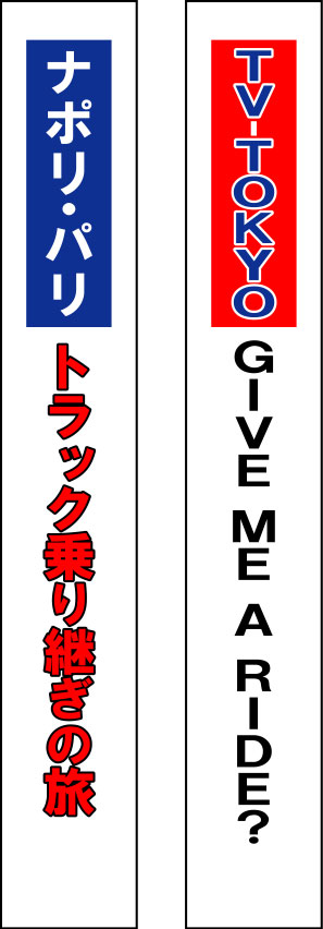 たすきの原稿を変更しました。前側の「TV-TOKYO GIVE ME A RIDE?」のTVとTOKYOの文字を白文字から紺文字へ変更しました。また、後側の「ナポリ・パリ トラック乗り継ぎの旅」の”トラック乗り継ぎの旅”部分に黒フチをつけました。文字の色は配置など、原稿内容に修正点・変更点などがありましたらご連絡ください。また画像をクリックすると拡大表示されます。