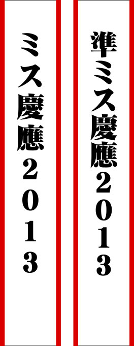 たすき名入れの原稿イメージをお送りいたします。既製品の赤ラインたすきに名入れ加工をします。たすき本体の大きさは横14cm×1周160cm、光沢感のある芯入りポリエステル生地を使用したタスキになります。左右には赤ラインを付け、輪仕立てに仕上げます。原稿の内容は、「ミス慶應2013」と「準ミス慶應2013」の2種類です。同じ文字をタスキの前後に印刷します。下のイメージは前半分の画像ですので実際には後側にも同じ文字が印刷されます。文字の大きさや書体は前回と同じ内容で、年号だけ変更したレイアウトとなっております。文字の大きさや位置など、原稿内容に修正点・変更点などがありましたらご連絡ください。また画像をクリックすると拡大表示されます。
