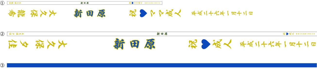 はちまきの原稿イメージをお送りいたします。①②③の3種類を各1本です。サイズは①が3cm幅×長さ150cm、②③が4cm幅×長さ300cmです。①、②は白地に刺繍、③は青の無地はちまきです。原稿の内容は、「新田原」の3文字を青字に金フチ取りで中央の額部分に刺繍します。
