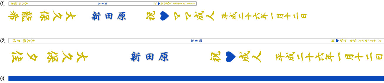 ①は左側に「大久保 龍希」、右側に「祝 ハート ママ成人 平成二十六年一月十二日」の文字を縦組みで刺繍します。ハートマークは青、それ以外は金文字です。