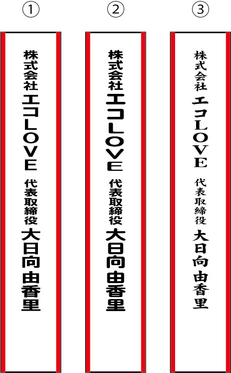 文字の内容は、「株式会社エコLOVE 代表取締役 大日向 由香里」の文字をタスキの前後に印刷します。下のイメージは前半分のレイアウトとなりますので実際には背中側にも同じ内容で印刷されるようになります。文字の書体は左側から①角ゴシック体、②丸ゴシック体、③楷書体の3通りの原稿を作成しておりますのでご検討くださいますようお願いいたします。画像をクリックすると大きく表示されますのでご覧ください。文字の大きさや位置、書体などに変更点等がございましたらご連絡くださいますようお願いいたします。