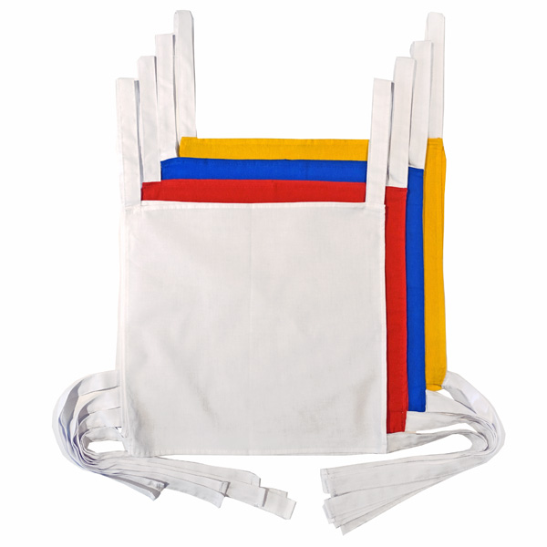 既製品のカラー無地ゼッケンを販売しております。オーソドックスな肩ひもタイプのゼッケンです。色は白、赤、青、黄色の4色、生地は木綿100%です。